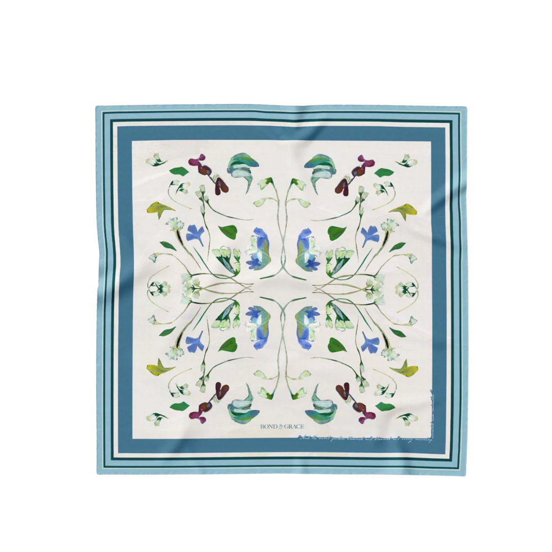 Wear the joyful spirit of springtime revival year-round. This enchanting silk scarf draws inspiration from The Secret Garden and its themes of health, rebirth, and the transformative power of nature. Featuring a mirrored motif drawing from the original Artwork Awakening by Artist Julia Hacker, delicate stems and floral petals intertwine.