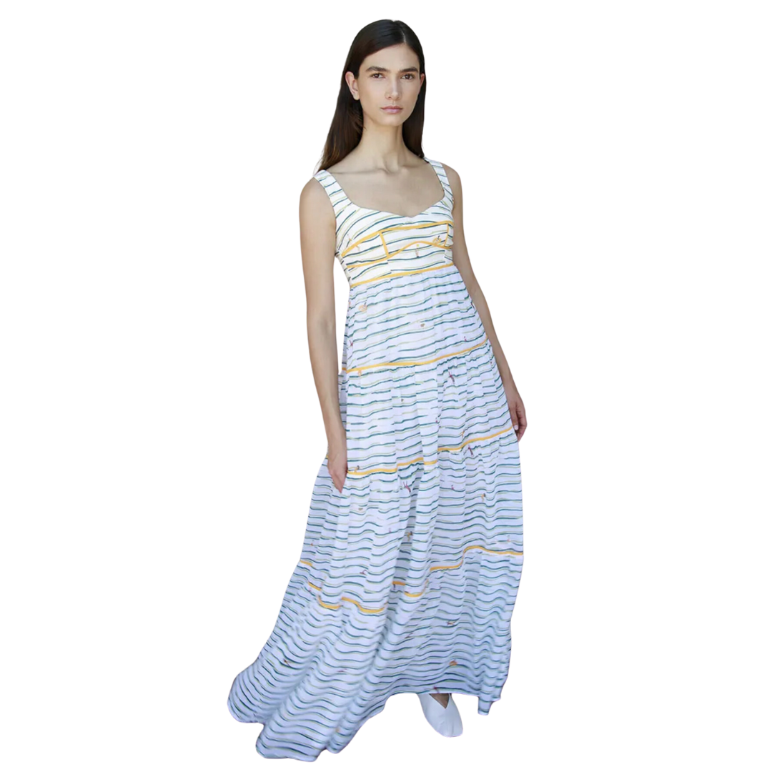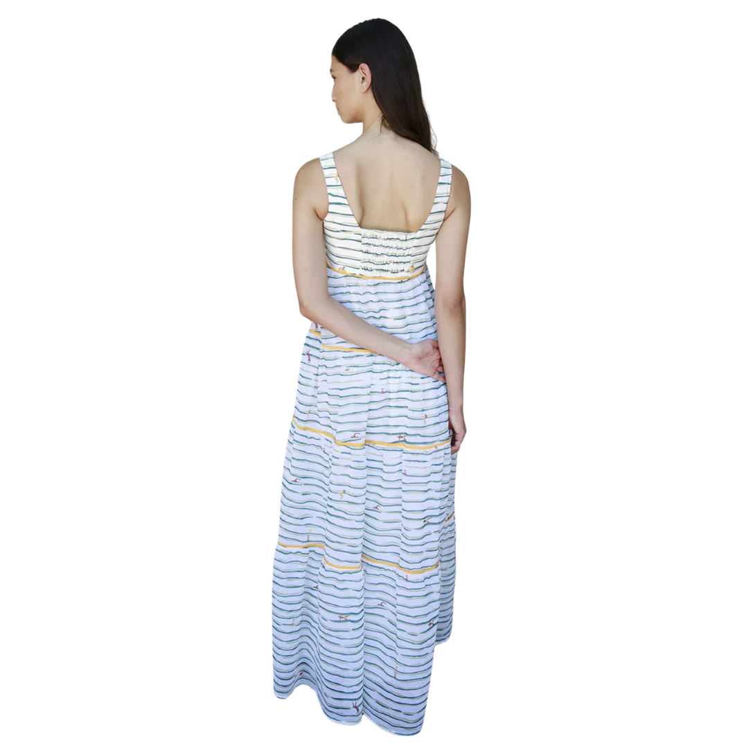 Embrace effortless elegance with the Baloo Dress, crafted from 96% cotton and printed with playful swimmers. This maxi dress features a tiered silhouette and a fitted bodice for a flattering fit. Perfect for a sunny day out, pair it with your favorite sandals for a chic, breezy look.