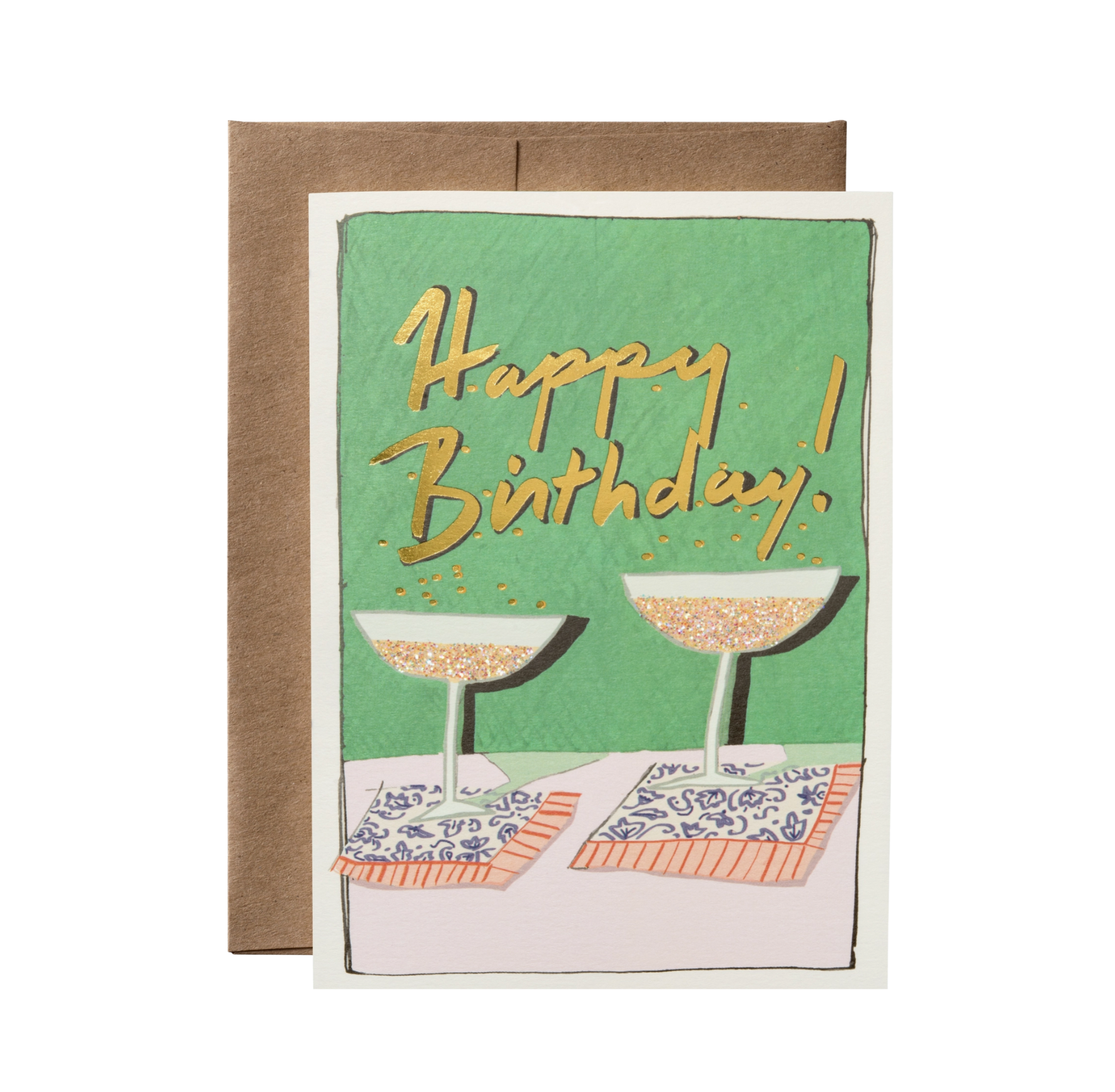 Full color ink printed on natural white paper, letterpress printed in gold foil, hand-glittered, and paired with a kraft envelope. Book folded card, blank on the inside. Paper color | natural white. Envelope color | kraft. Print process | full color + letterpress. Embellishment | gold foil. Dimensions | 4.5 x 6.25 inches.