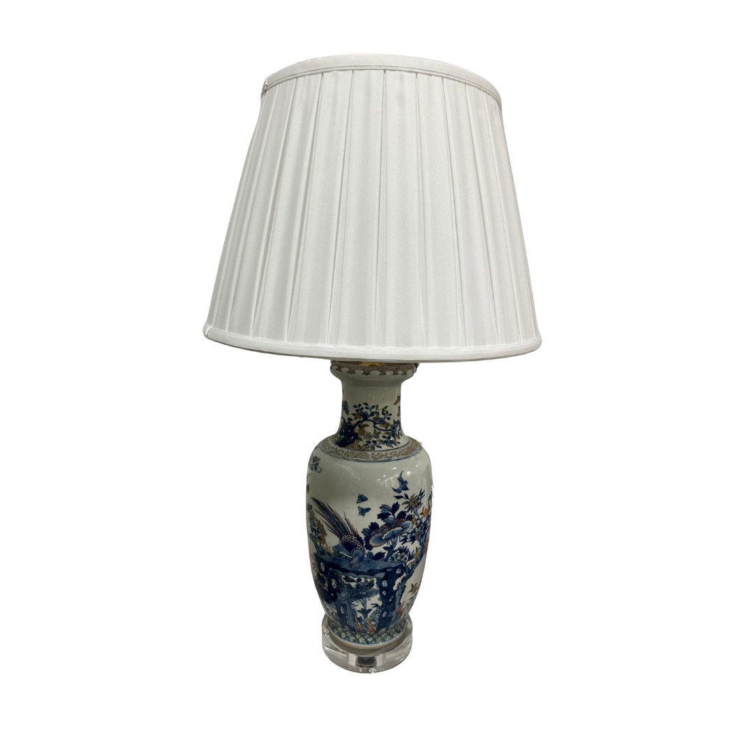 This Blue Rose Famille Lamp showcases exquisite blue and white porcelain craftsmanship, reflecting traditional famille ware artistry. Its elegant floral motifs add a refined touch to any interior, while the quality materials ensure durability and timeless appeal. 28" Tall.