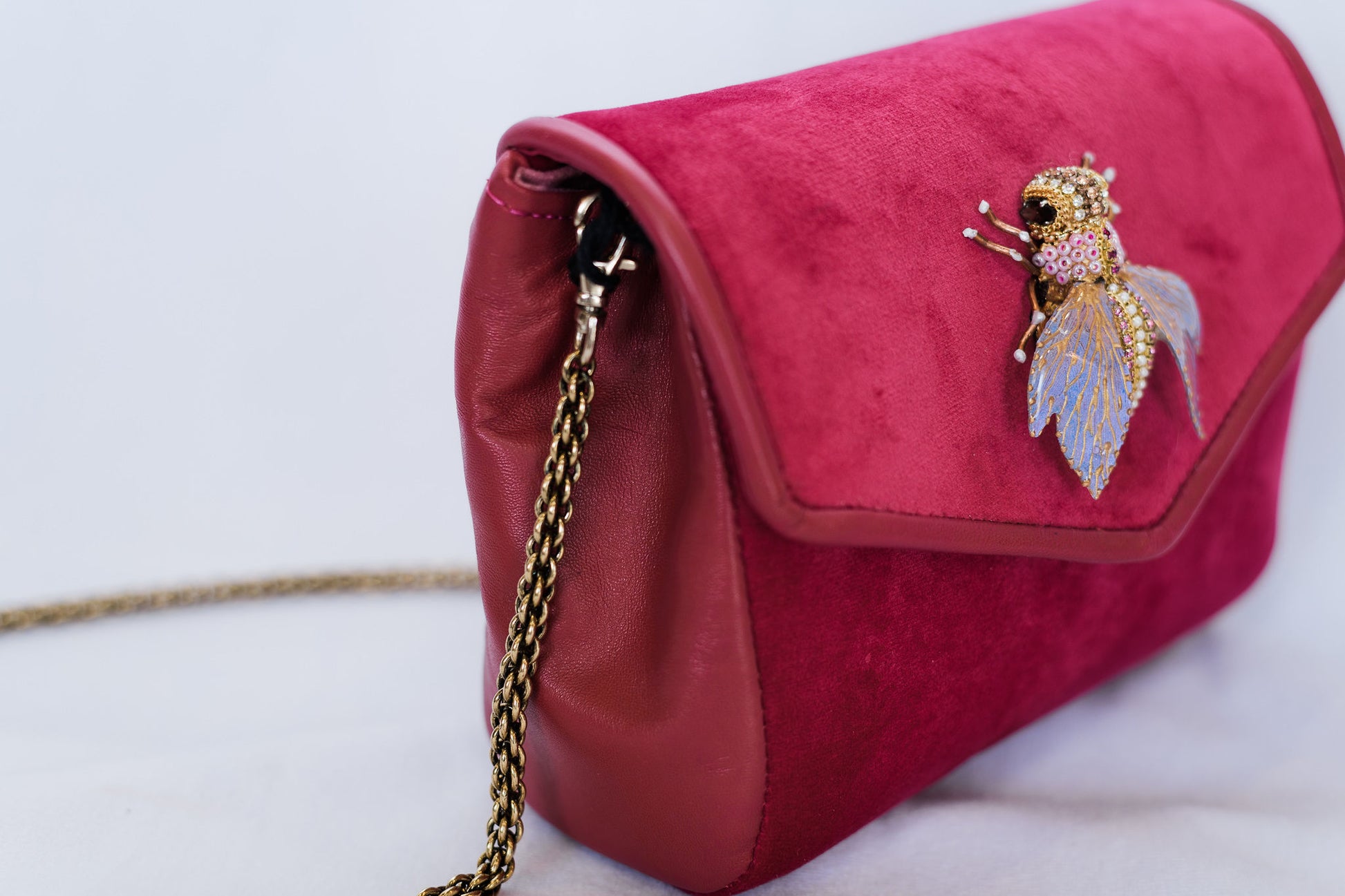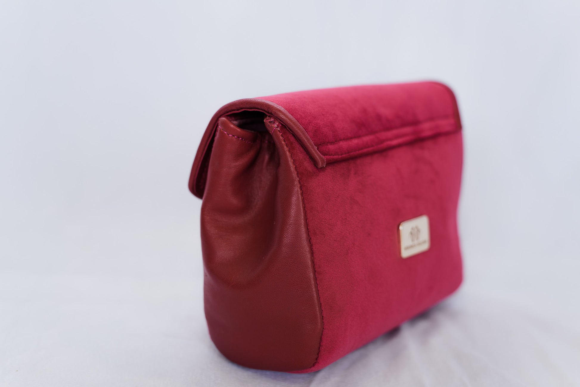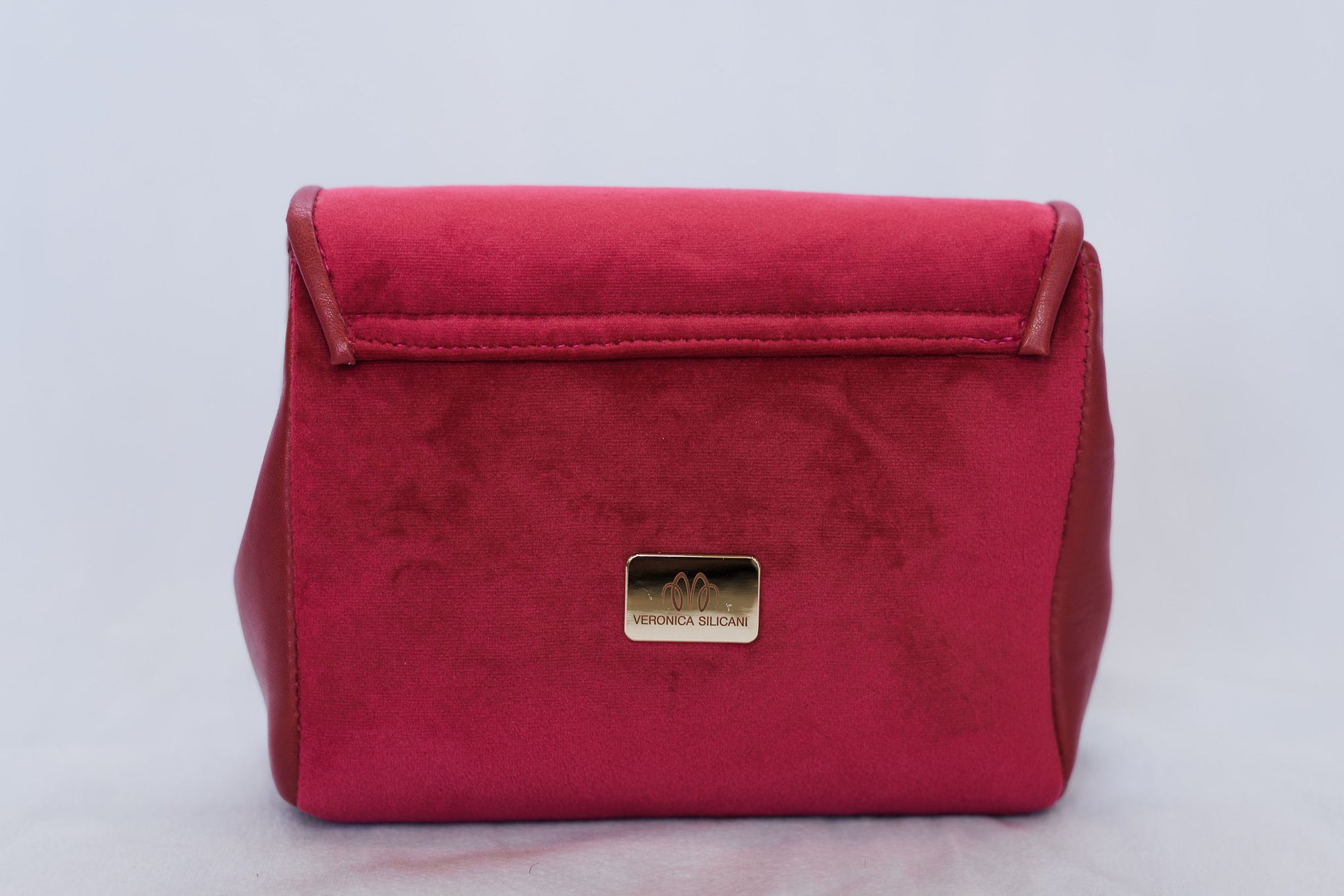 Each bag is unique and completely handmade. Elegant small handbag, in the “Bags and the City” limited edition. Made of solid color velvet fabric and high-quality leather. Leather interior lining with pocket and removable leather shoulder strap.
