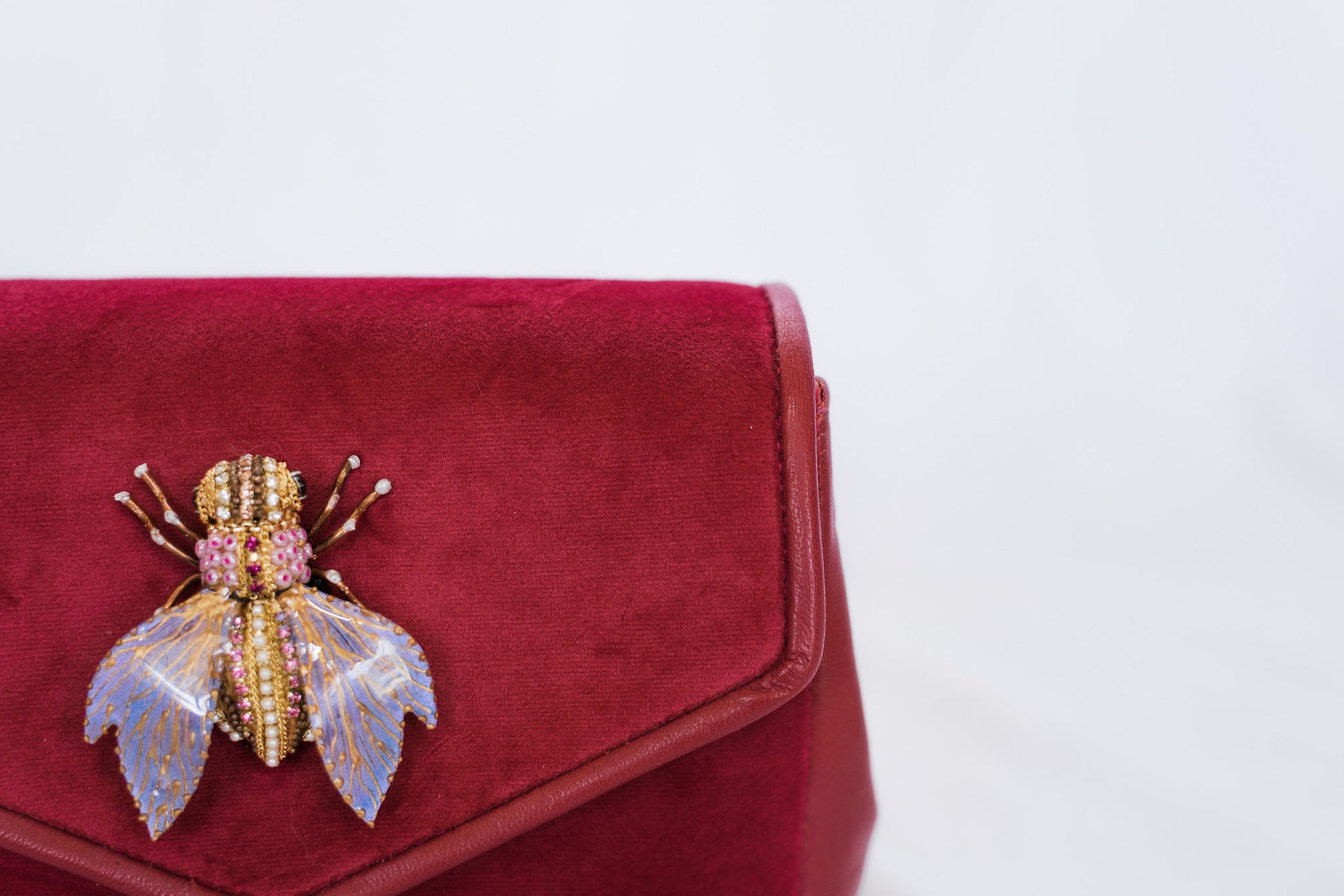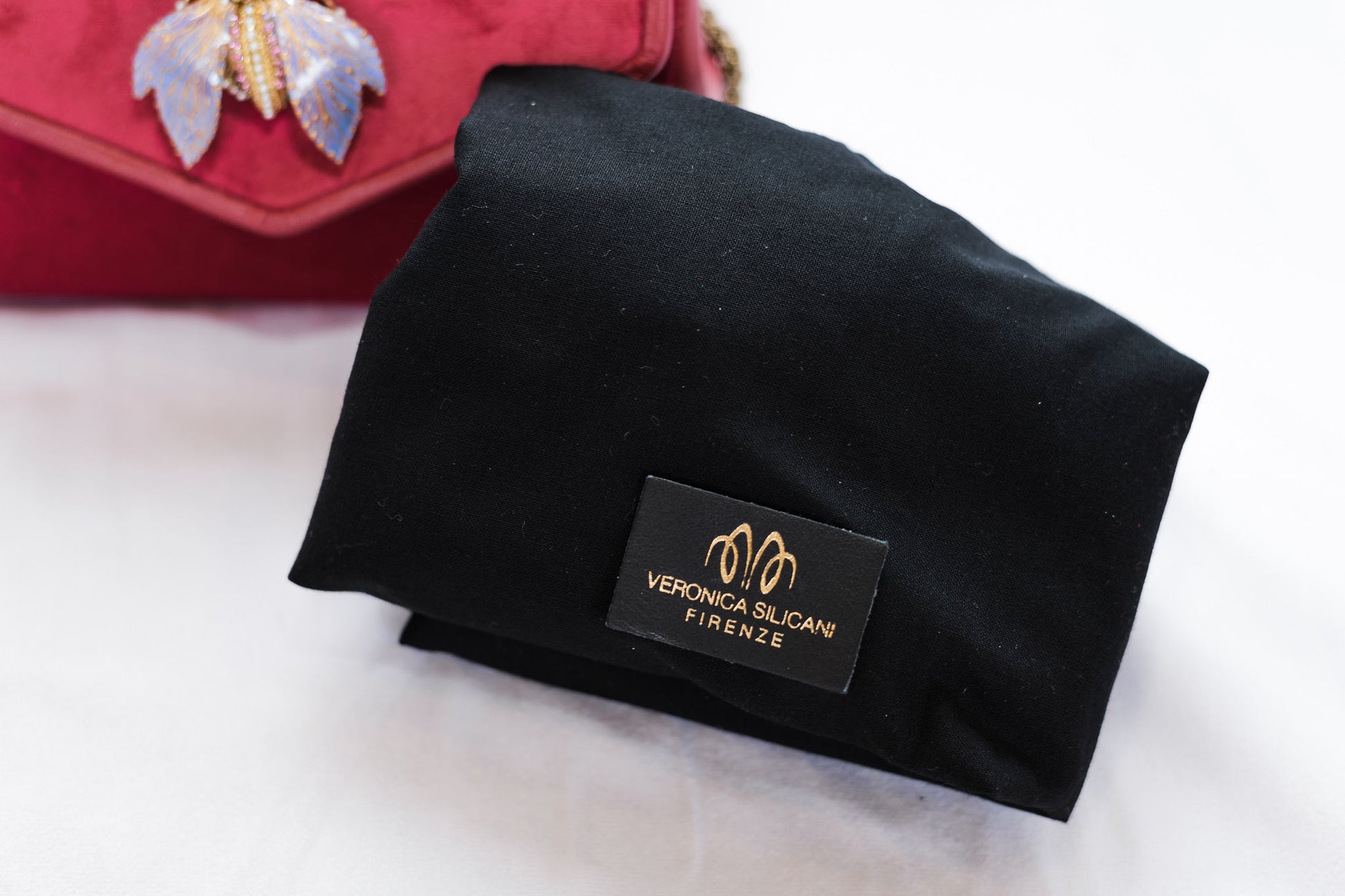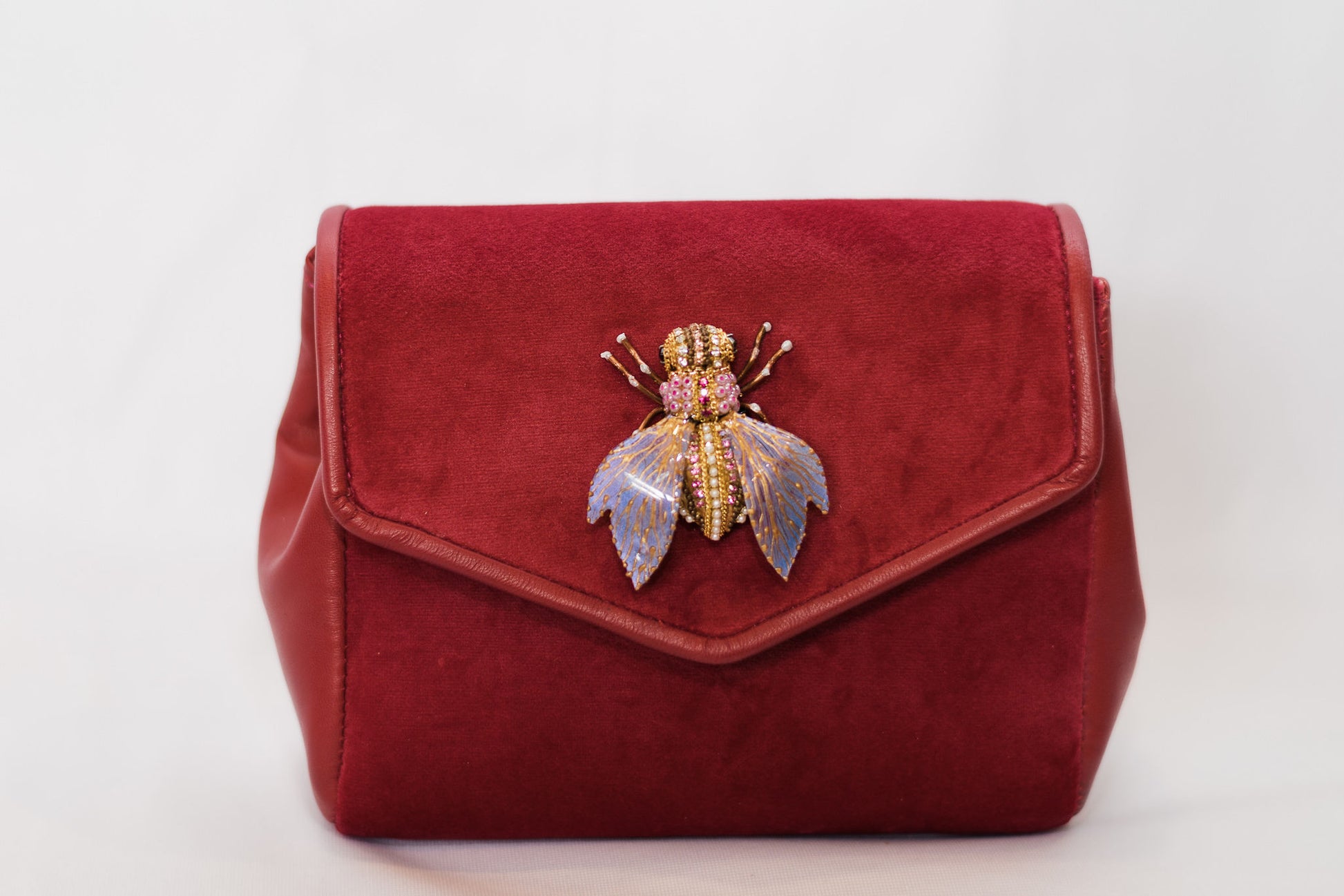 Each bag is unique and completely handmade. Elegant small handbag, in the “Bags and the City” limited edition. Made of solid color velvet fabric and high-quality leather. Leather interior lining with pocket and removable leather shoulder strap.
