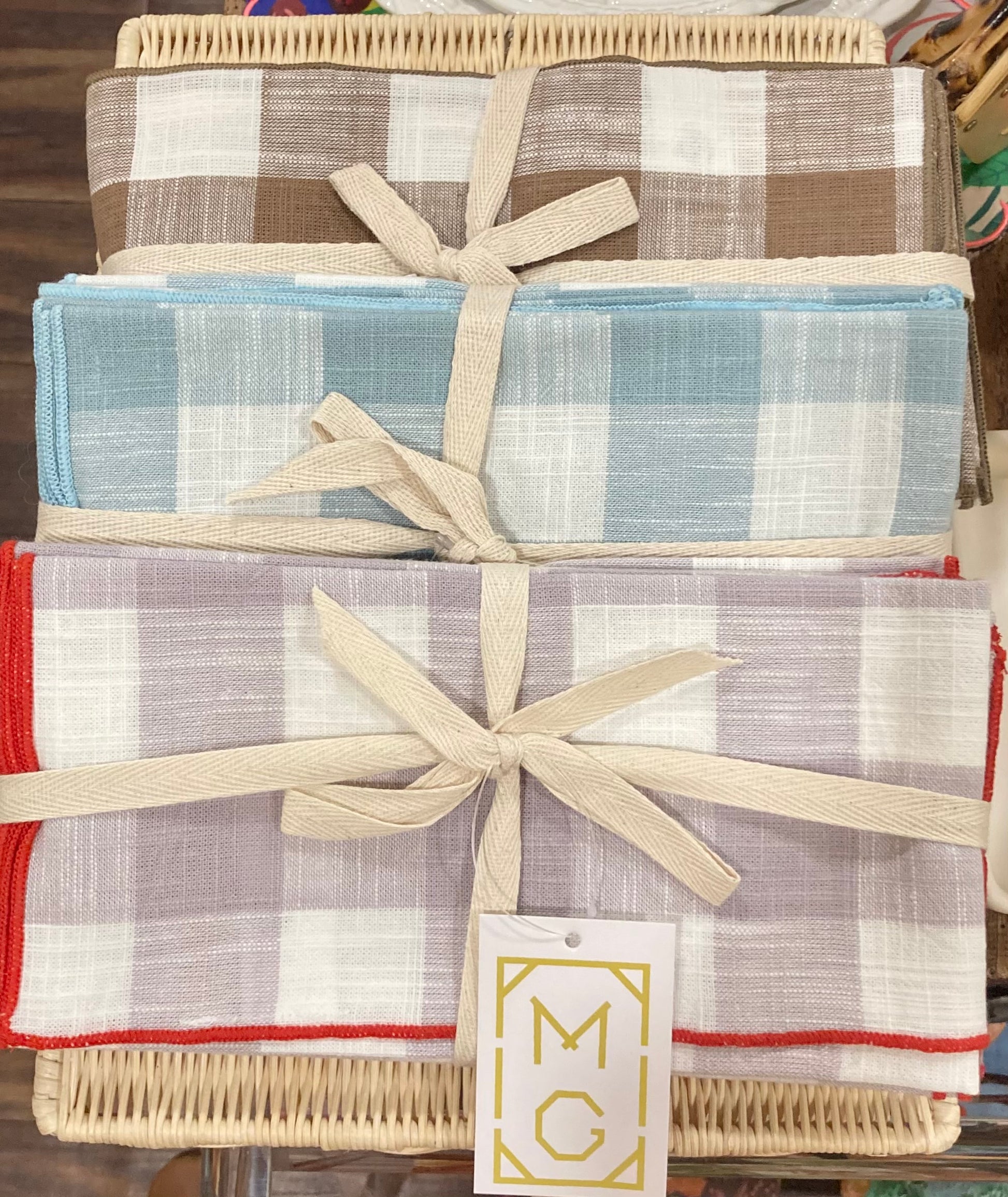 These come as a set of 4 napkins in chocolate, lavender, or blue.