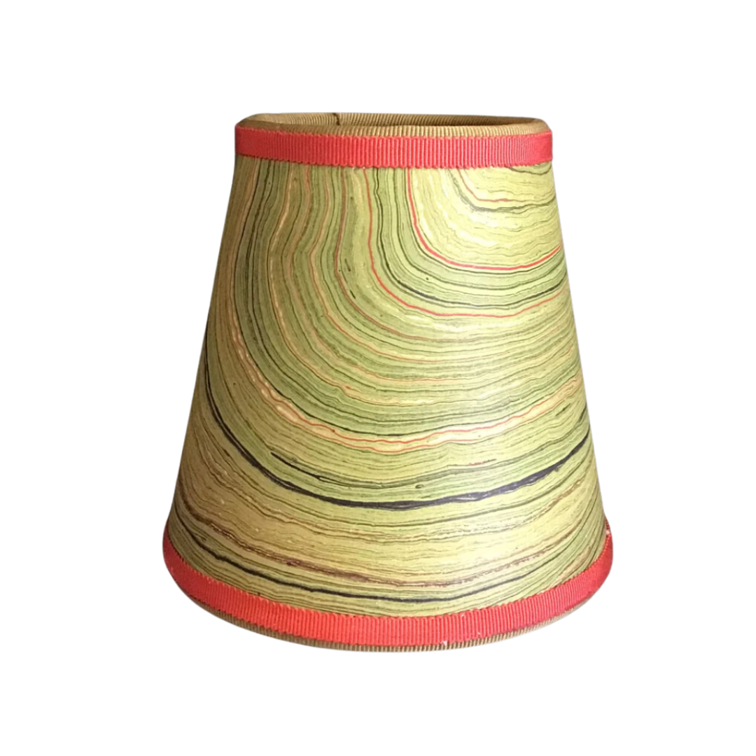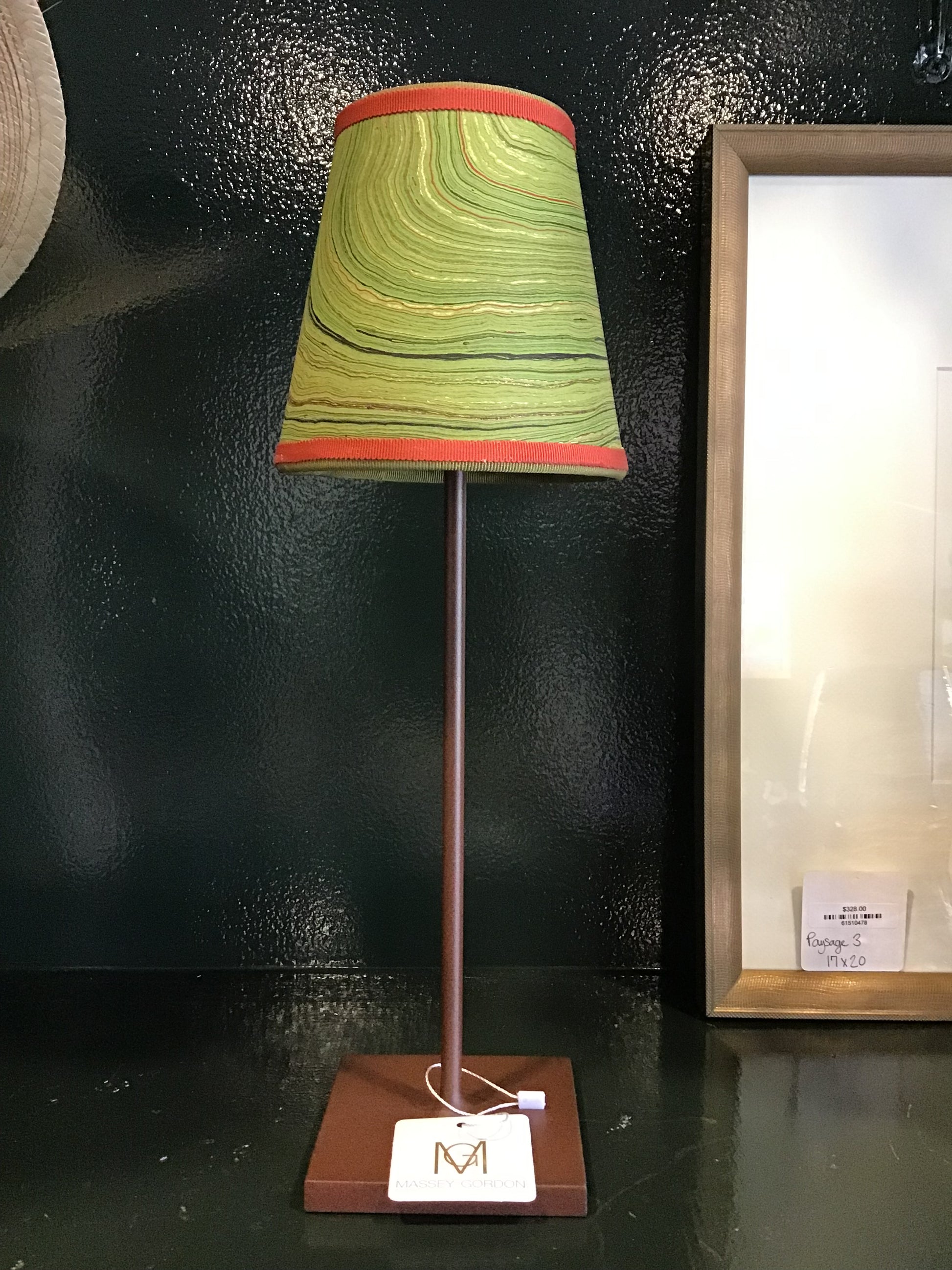 This marble paper lampshade has a washer top. Marble paper is hand made on smaller sheets of paper. There will be extra seams in the back of this shade.