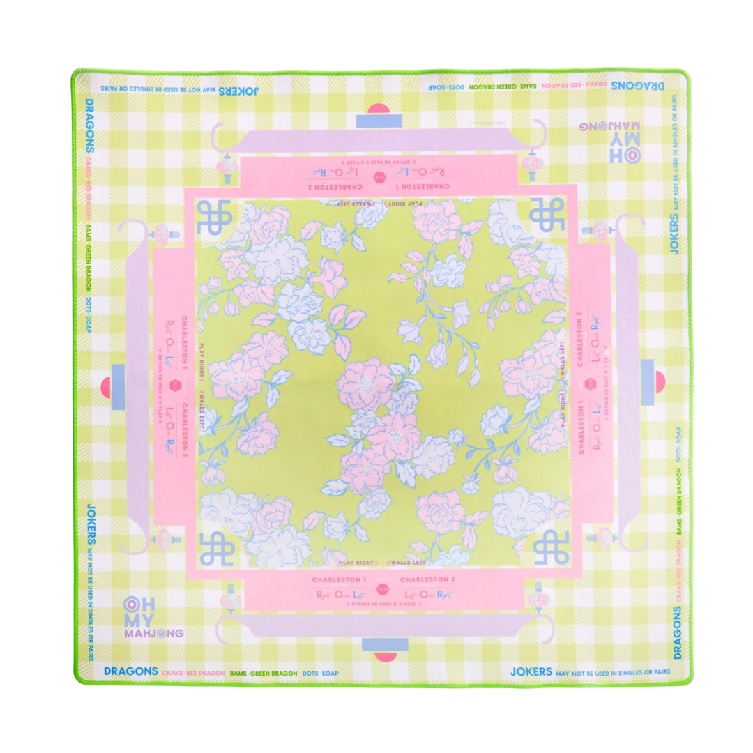 Introducing the Garden Party Mahjong Mat—a delightful combination of vibrant pastel hues and enchanting florals, intertwined with a charming green gingham pattern. This neoprene mat features a non-slip bottom to ensure your tiles stay perfectly in place, game after game. Adorned with delicate blossoms and inviting colors, it exudes a frilly femininity that is both elegant and playful. Along the sides of the mat, you’ll find the signature Oh My Mahjong instructional reminders, guiding you through each round.