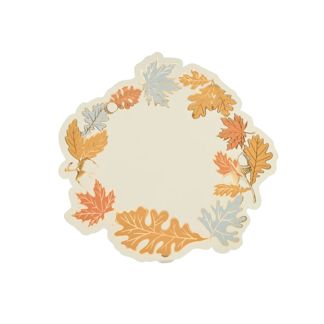 Add a festive touch to your table with our Gilded Harvest Placemats, die-cut in a stunning wreath of harvest leaves. Featuring gold foil accents and crafted from card stock, these 16" die cut placemats bring elegance to any fall gathering—then toss for easy cleanup!