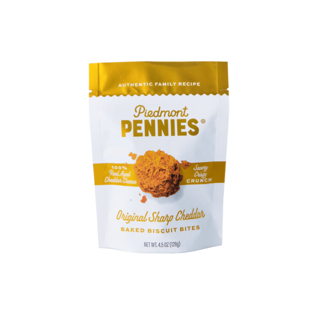 The flavor that started it all — Original Sharp Cheddar Piedmont Pennies — comes from my Grandbetty’s treasured Southern family recipe. I first baked these crispy, buttery cheese crackers for an MBA class project in 2020, and they quickly grew into a beloved snack shared far beyond the classroom.