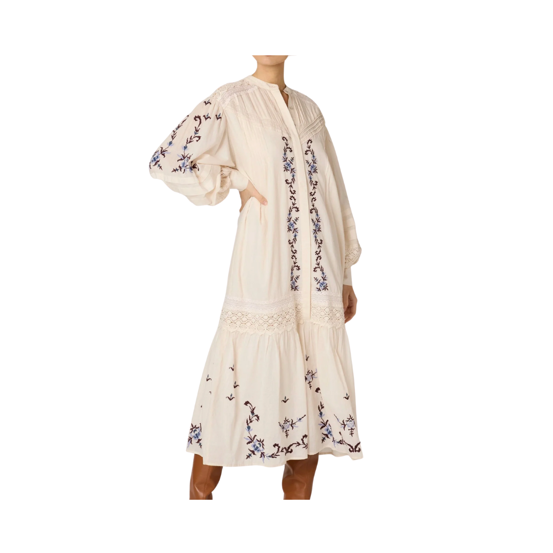 The Heidi Midi Dress is made from 100% GOTS certified organic cotton, offering a timeless silhouette with thoughtful detail. This long-sleeve, high-neck midi dress features delicate chainstitch embroidery, pintuck accents, and inserted lace detailing—perfect for elevated everyday wear or special occasions with a touch of vintage charm.