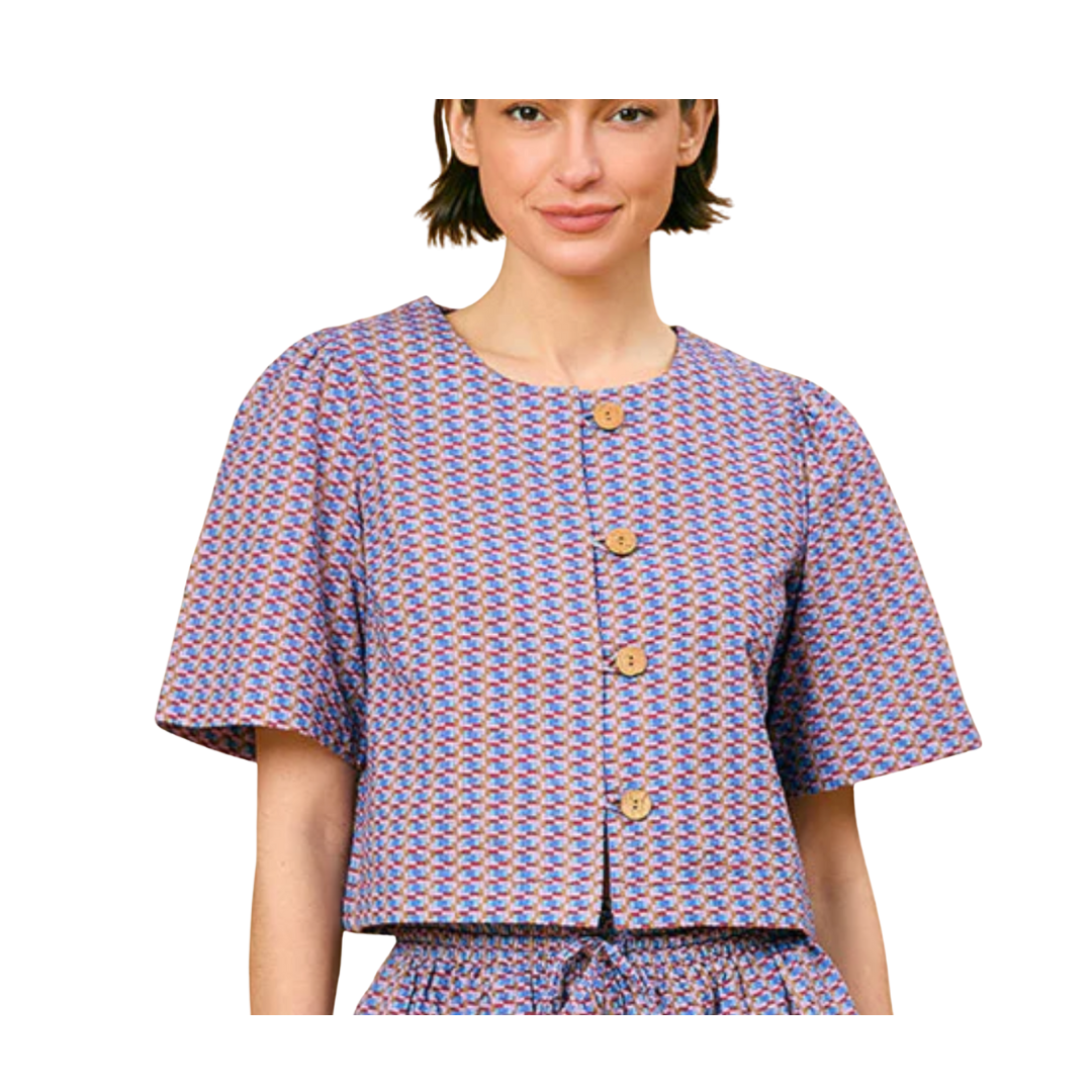 A charming take on a classic button-up silhouette, the Heidi Top is both easy and elevated. Finished with scalloped sleeves, tonal covered buttons, and subtle structure, it pairs effortlessly with skirts or high-rise bottoms for a polished, relaxed look.