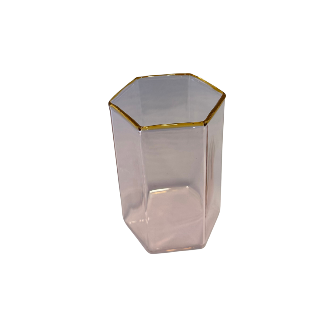 This Small Hexagon Vase in pink glass with an amber rim showcases expert craftsmanship with its handmade quality. Its unique geometric shape and vibrant colors make it a versatile piece—ideal as a small vase or an elegant lowball glass. Perfect for adding a touch of refined color and form to any setting.