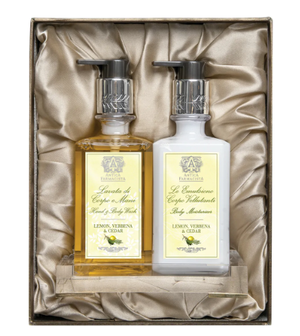 THE PRODUCT: Antica allows you to make your gift giving thoughtful, personalized and luxurious. This exquisite gift set includes Hand & Body Wash, Body Moisturizer and our new Acrylic Bath & Body tray in a decorative two-piece gift box, perfectly packaged and ready for gift giving.