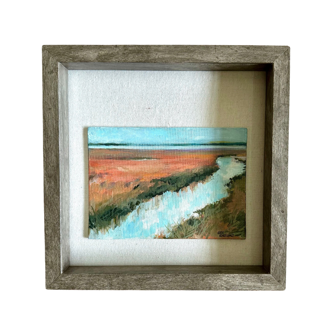 Original 5”x7” gouache study of a rosy hued saltmarsh, painted on archival quality canvas panel.