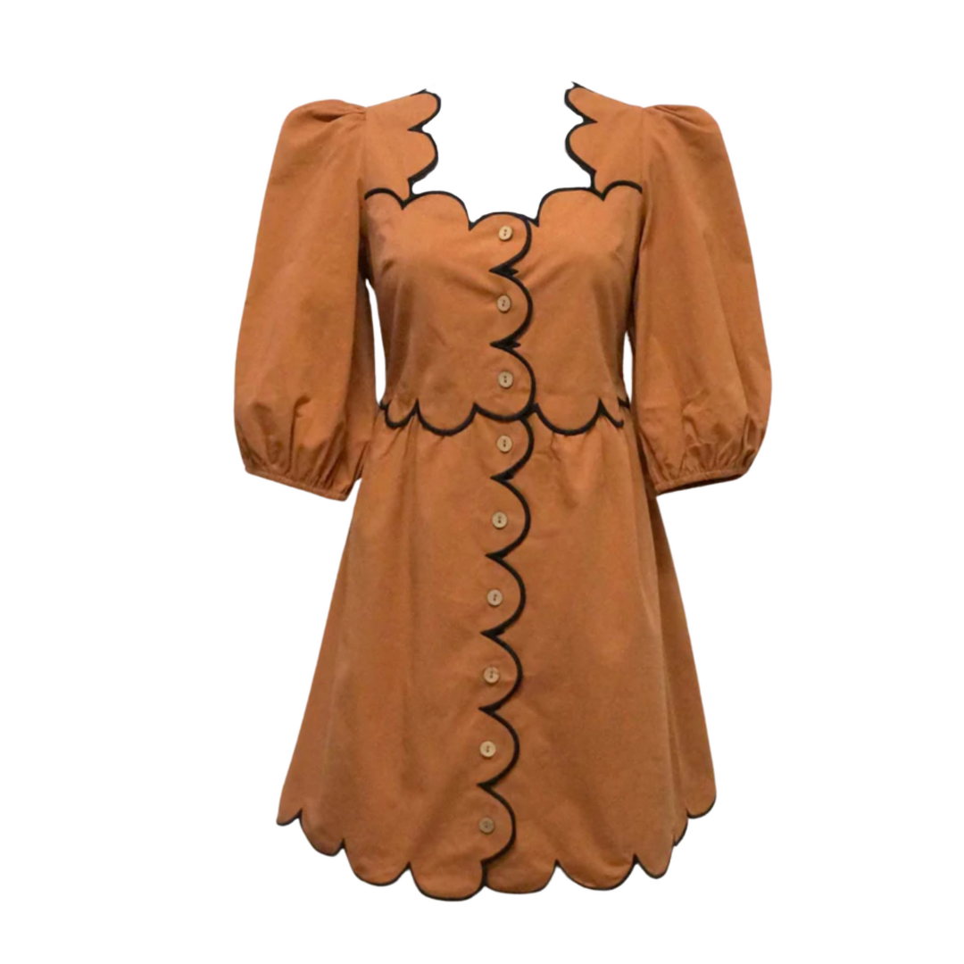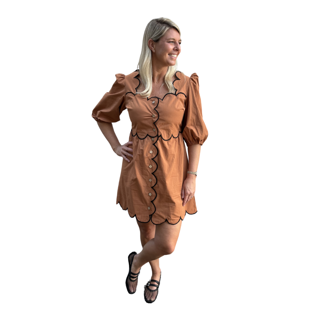 The Lydia Scalloped Mini Dress in Camel features black embroidery trims around the edges of the scallops and wooden buttons down the front.
