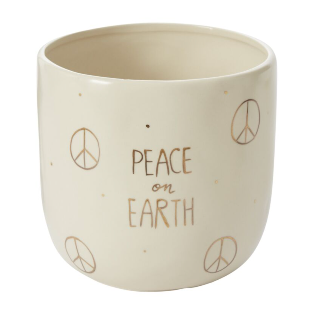 A wish for the holidays & all year long, the Peace on Earth Pot features a hand painted metallic gold phrase on creamy white stoneware with peace signs across the outside. Add a drop-in peace lily or small poinsettia for a stunning holiday scene.