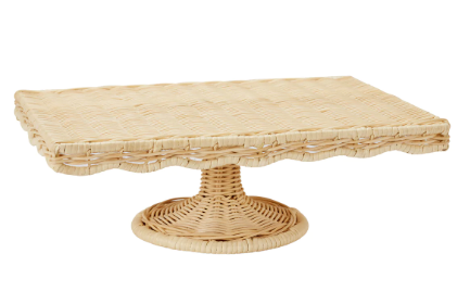 For casual entertaining, our rectangular Rattan Serving Stand is an Amanda must. Designed to accommodate a 9” x 13” sheet cake, it’s also ideal for staging a stack of cupcakes, colorful petit fours, or raising your charcuterie board to the perfect height for sampling. The classic silhouette is tightly hand woven of natural rattan over a sturdy wire frame and finished with a charming, scalloped edge. We recommend using a cake sheet, plate, or trivet beneath food to protect the weave from spills and crumbs.