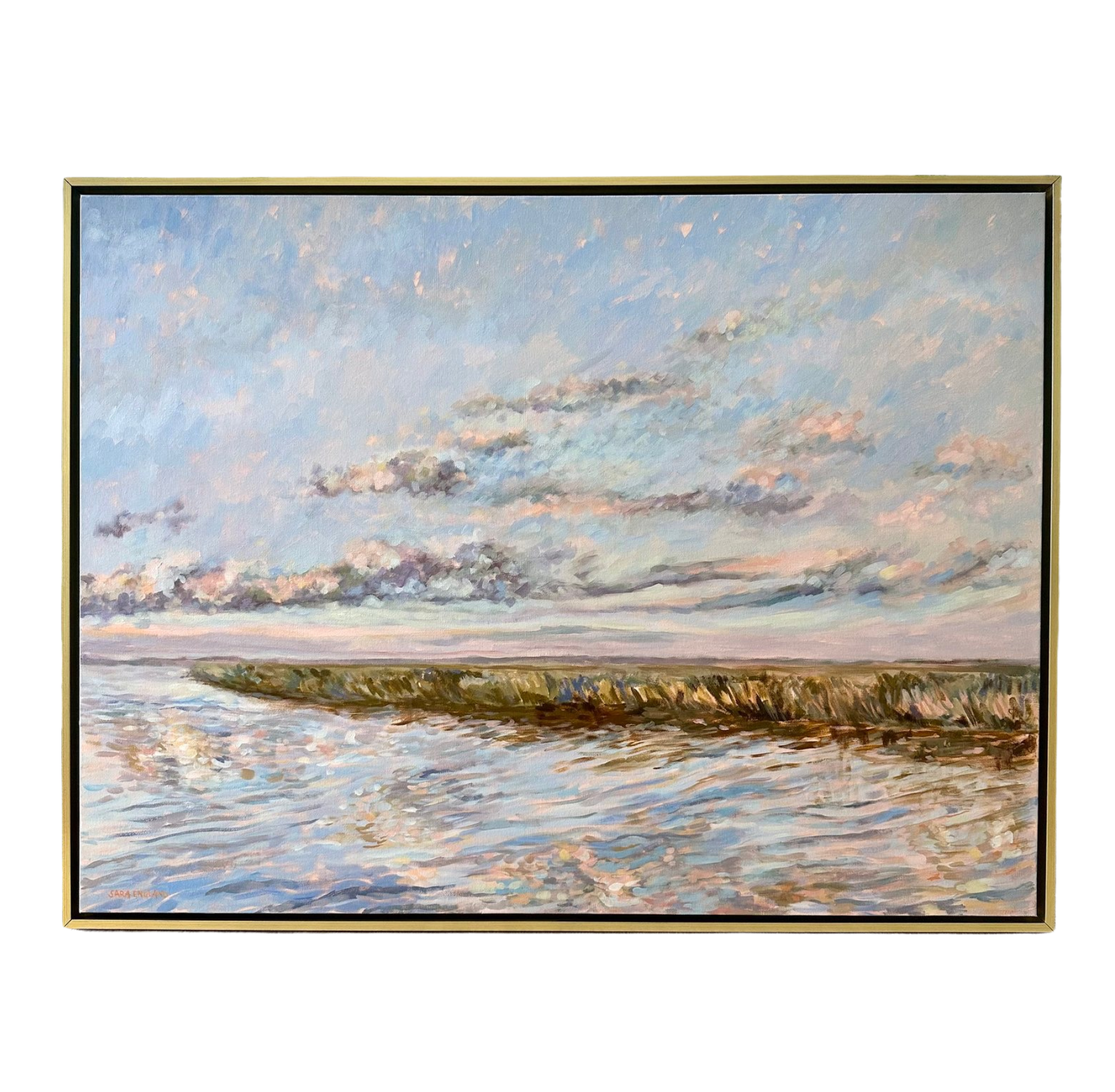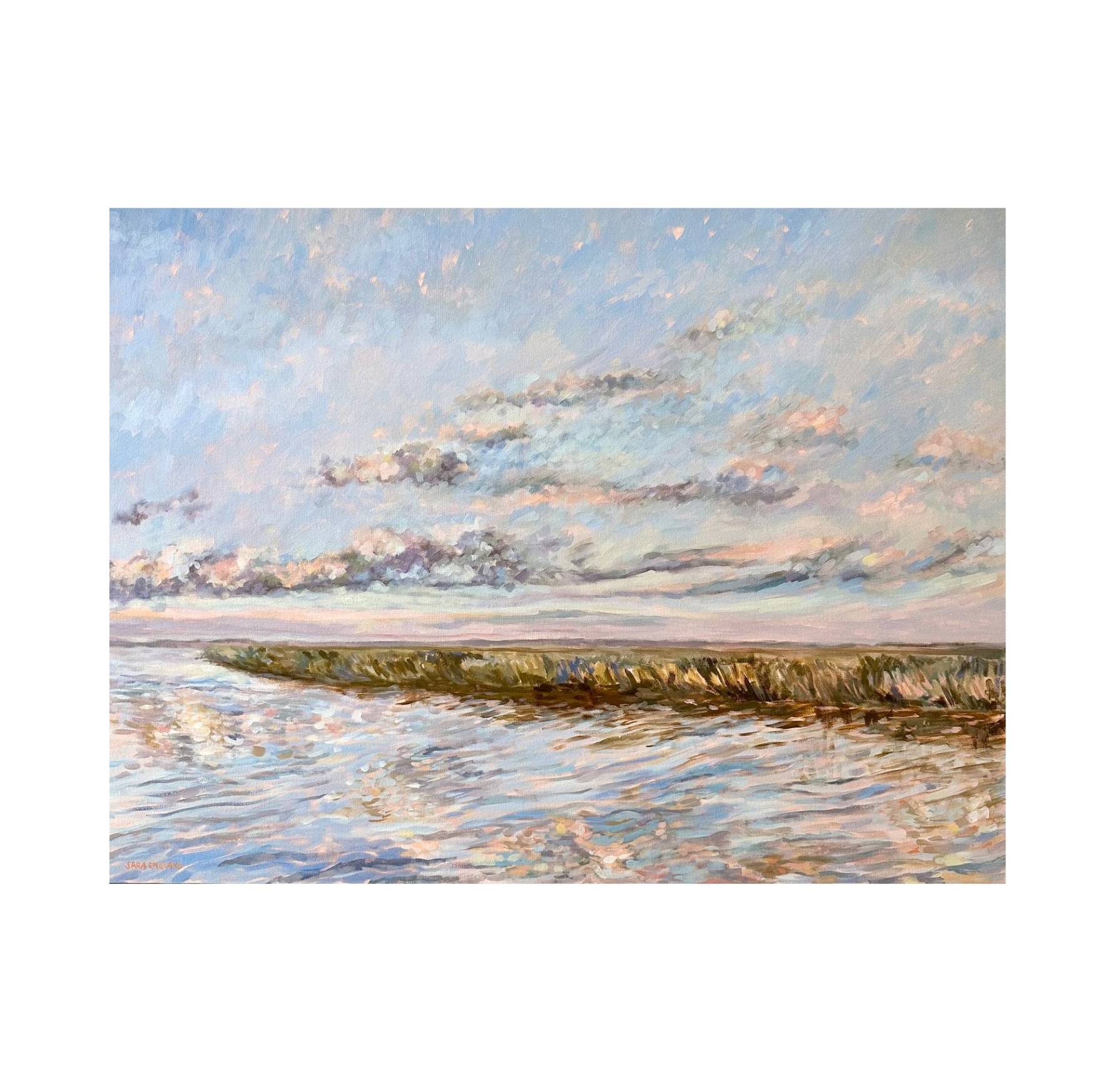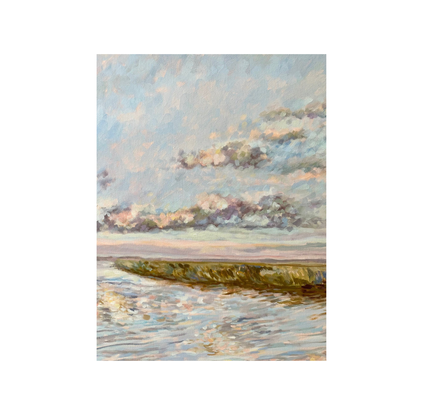 An original acrylic painting of the Lowcountry at dawn. Peace and tranquility abounds in this gentle depiction of the salt-marshes of our beautiful Southern coastline.