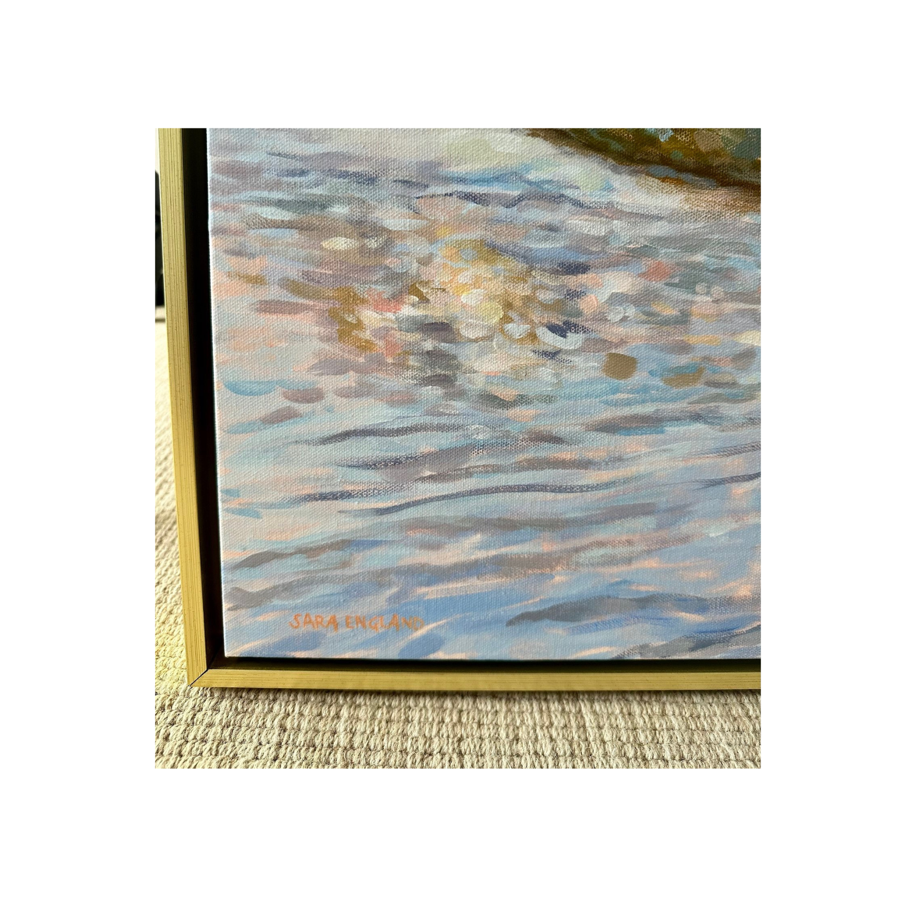 This piece measures 30”x40” and is framed in a soft gold floater frame. It is signed and wired on the back ready to hang in your home.