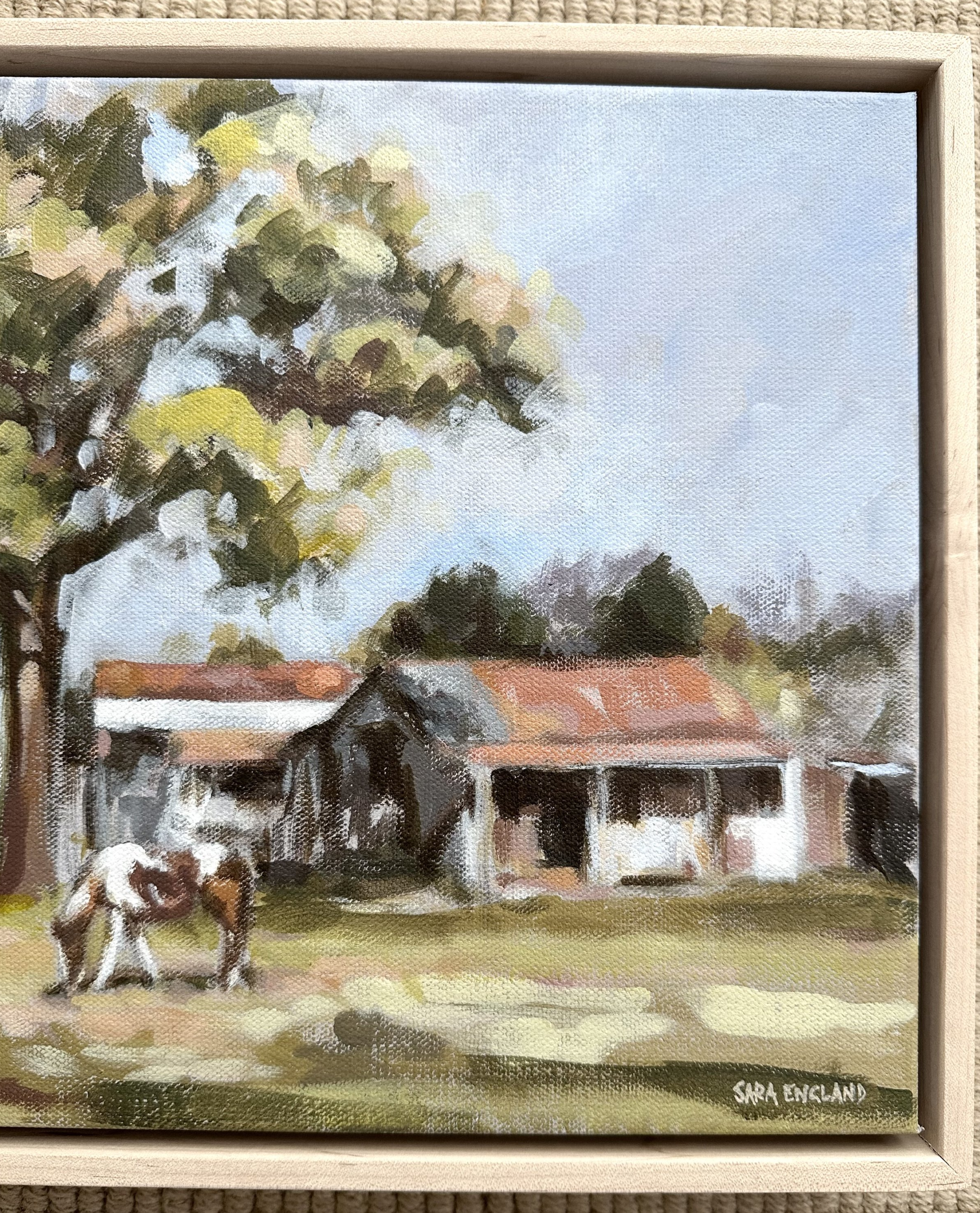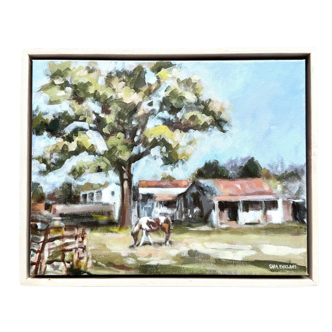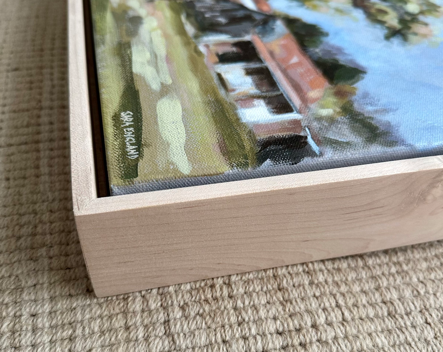 Original acrylic painting measuring 11”x14” and framed in a beautiful natural maple floater frame.
