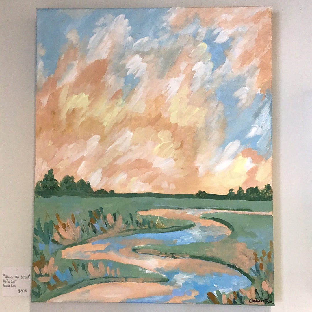 "Under the Sunset" is a 16x20 inch acrylic painting on canvas. "This piece is meant to bring back memories of all the beautifully colored sunsets over the marsh."