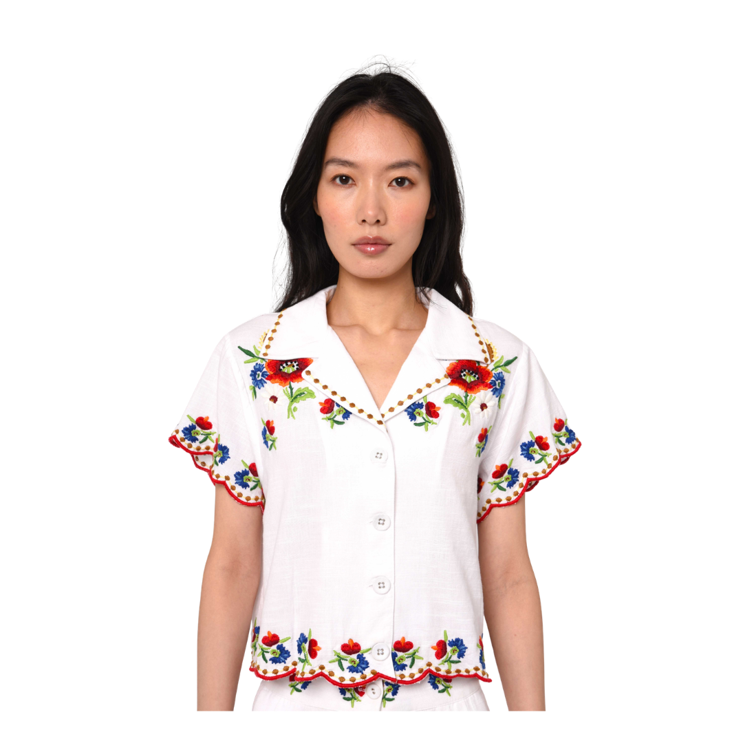 The Vera Top is a charming button down blouse featuring vibrant floral embroidery and a classic notched collar. This short-sleeve style creates a perfectly coordinated look when paired with the matching Berri midi skirt.