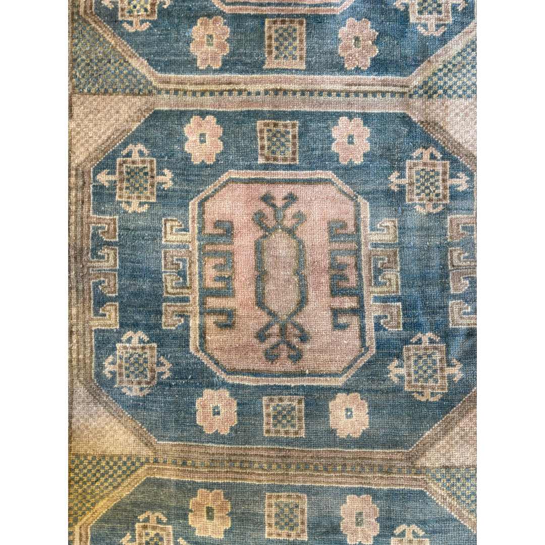 Vintage runner with hues of blue and pink, measuring 9'10"x3'2".